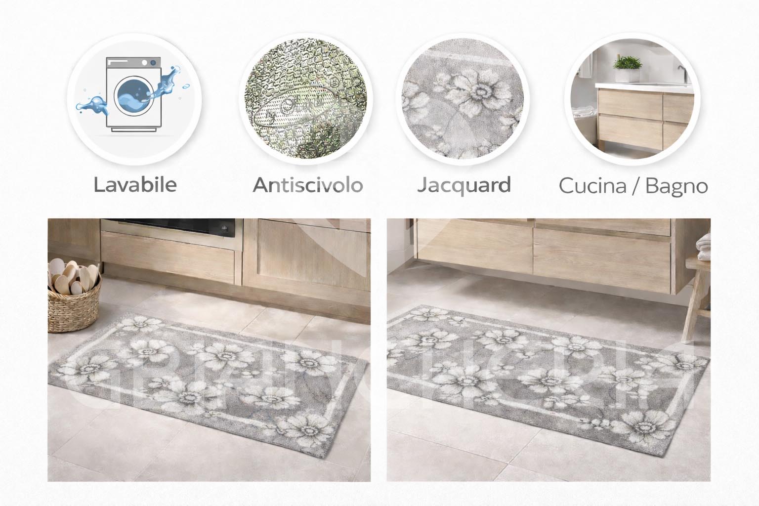 Grazie al sottofondo antiscivolo e alla possibilità di lavarlo in lavatrice, è adatto all’uso quotidiano in cucina, bagno, corridoio e zone di passaggio. La texture jacquard esalta il disegno floreale e rende il tappeto piacevole sia alla vista sia al tatto.