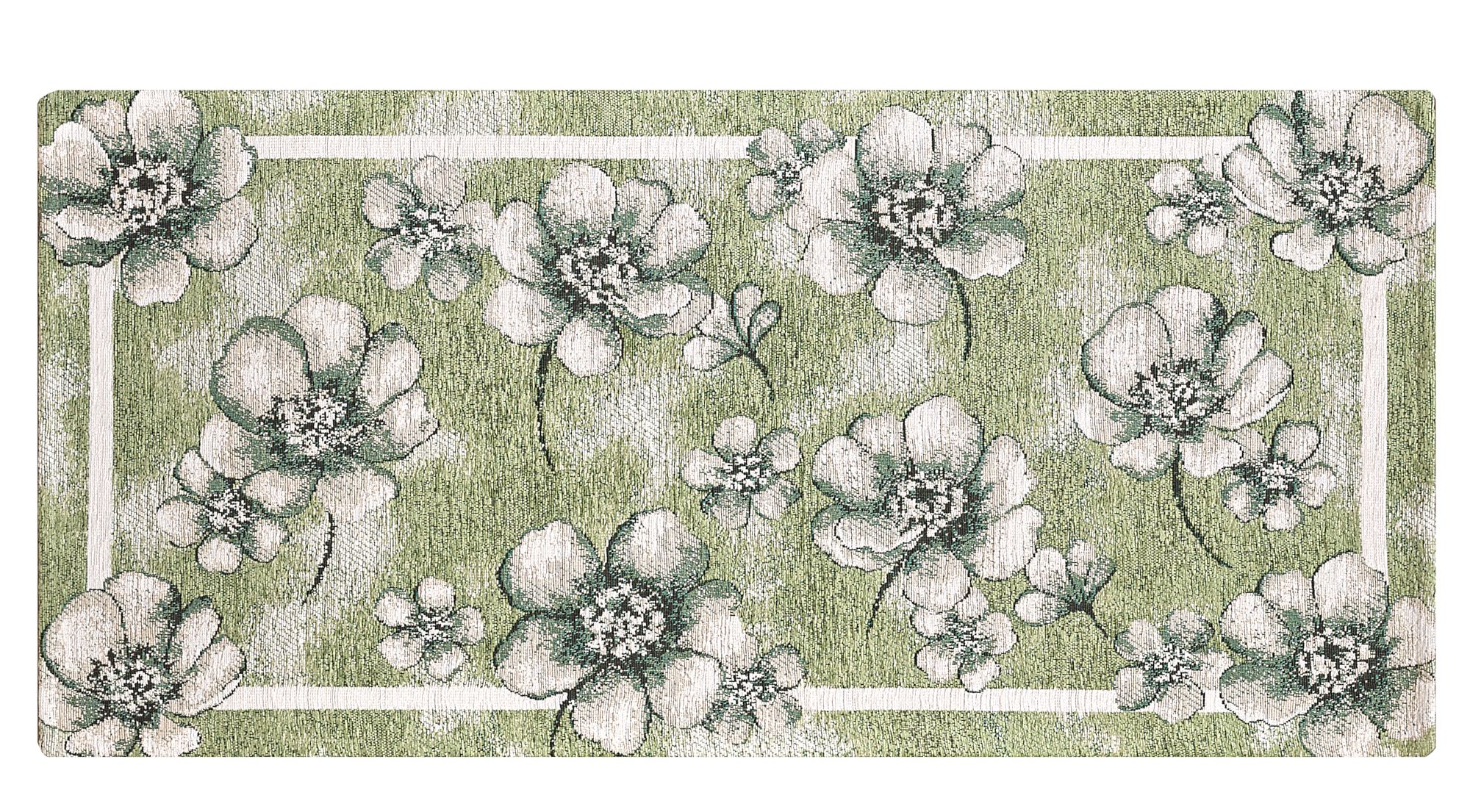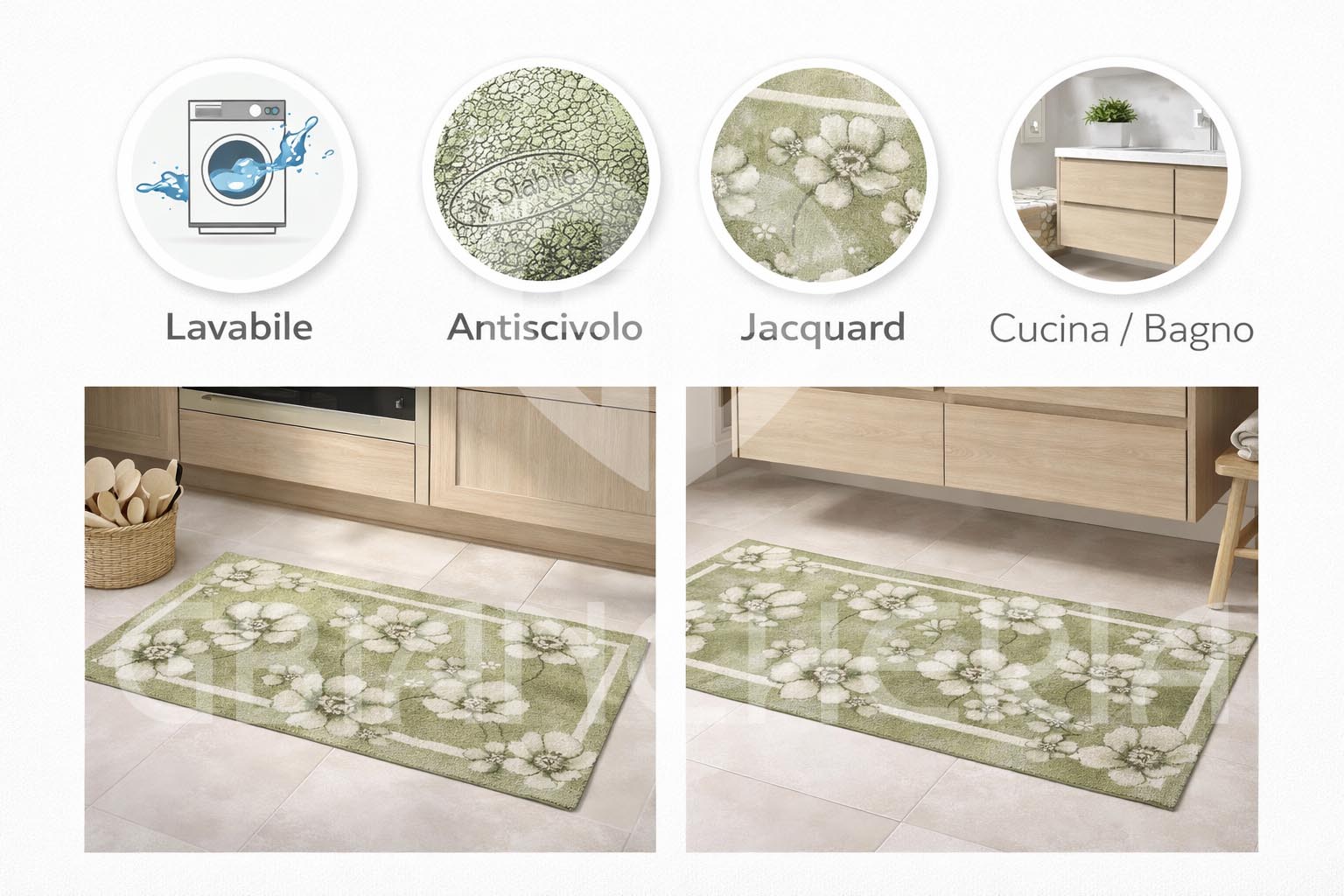 Con sottofondo antiscivolo e lavabile in lavatrice, è pensato per l’uso quotidiano in cucina, bagno, corridoio e altre zone di passaggio. La lavorazione jacquard mette in evidenza il disegno floreale e dona al tappeto una resa tessile ricca e curata.