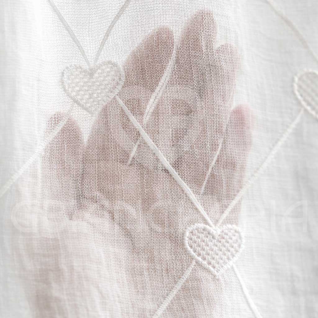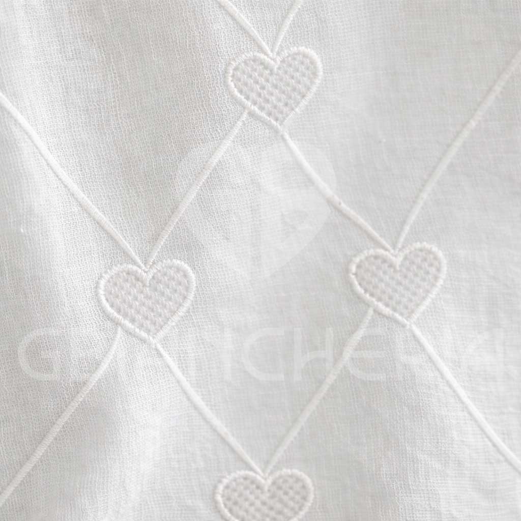 Il tessuto leggero lascia filtrare la luce naturale creando ambienti luminosi e accoglienti, mentre il raffinato ricamo a rombi con cuori dona alla tenda un delicato effetto decorativo.