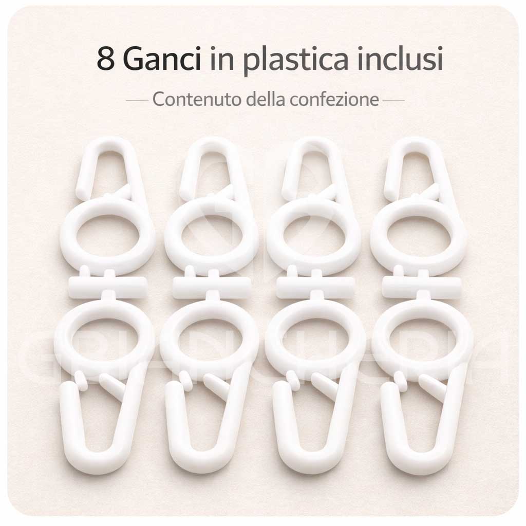 La tenda è dotata di anelli e ganci inclusi, che permettono un montaggio semplice su bastoni o supporti già presenti sul balcone.