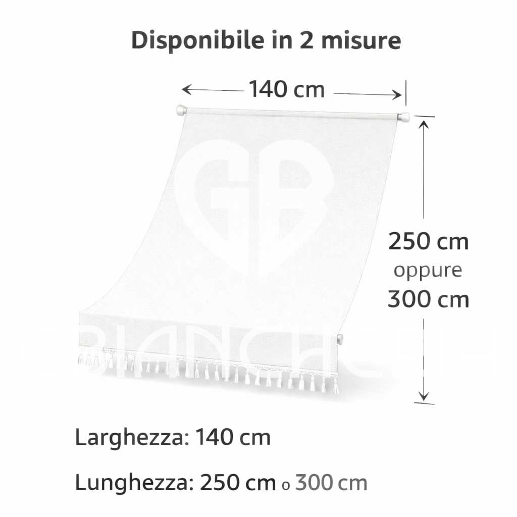 Dotata di frangia decorativa e di anelli con ganci inclusi per un montaggio semplice, è disponibile in larghezza 140 cm e lunghezza 250 o 300 cm, in diverse varianti tinta unita o rigata.