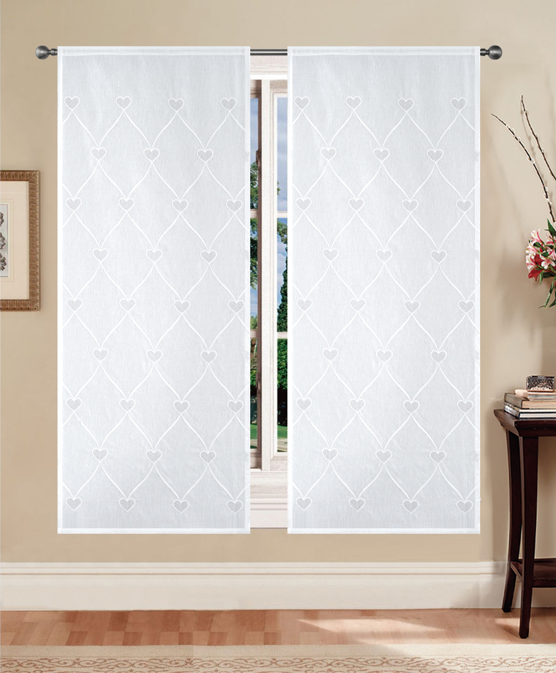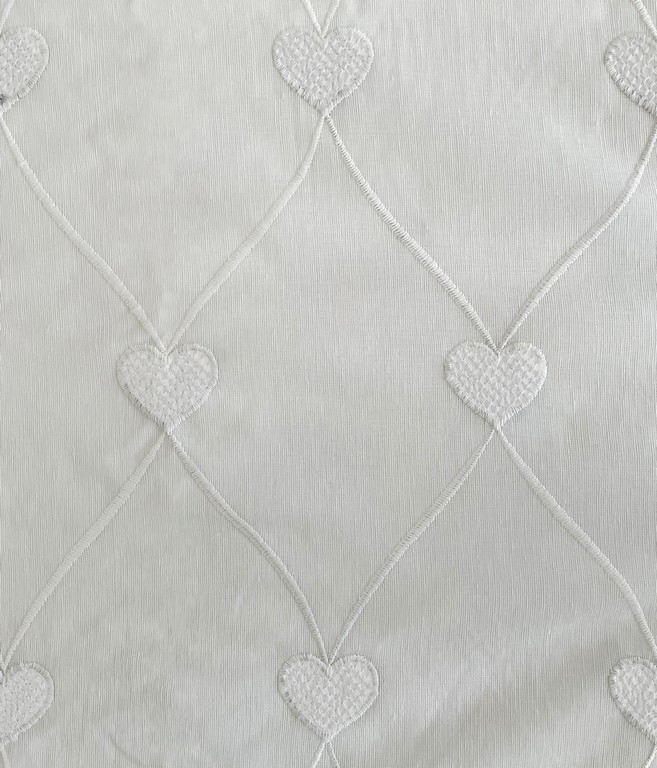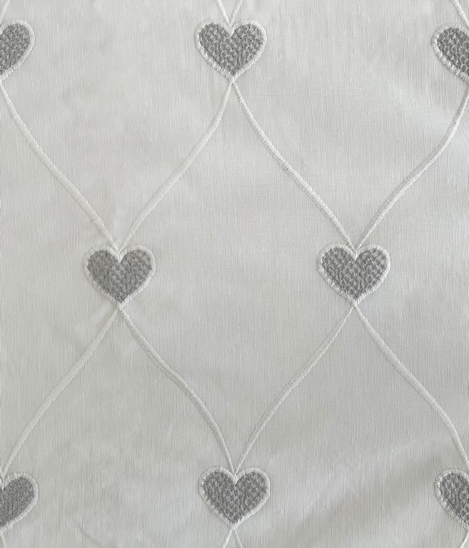 Tenda Giulia è la scelta ideale per chi desidera una tenda bianca semitrasparente dal design romantico e raffinato. Il tessuto lascia filtrare la luce naturale creando ambienti luminosi, mentre il ricamo a rombi con cuori aggiunge un tocco decorativo elegante. La base della tenda è sempre bianca; la variante colore si riferisce esclusivamente al cuore ricamato, disponibile in bianco oppure grigio.