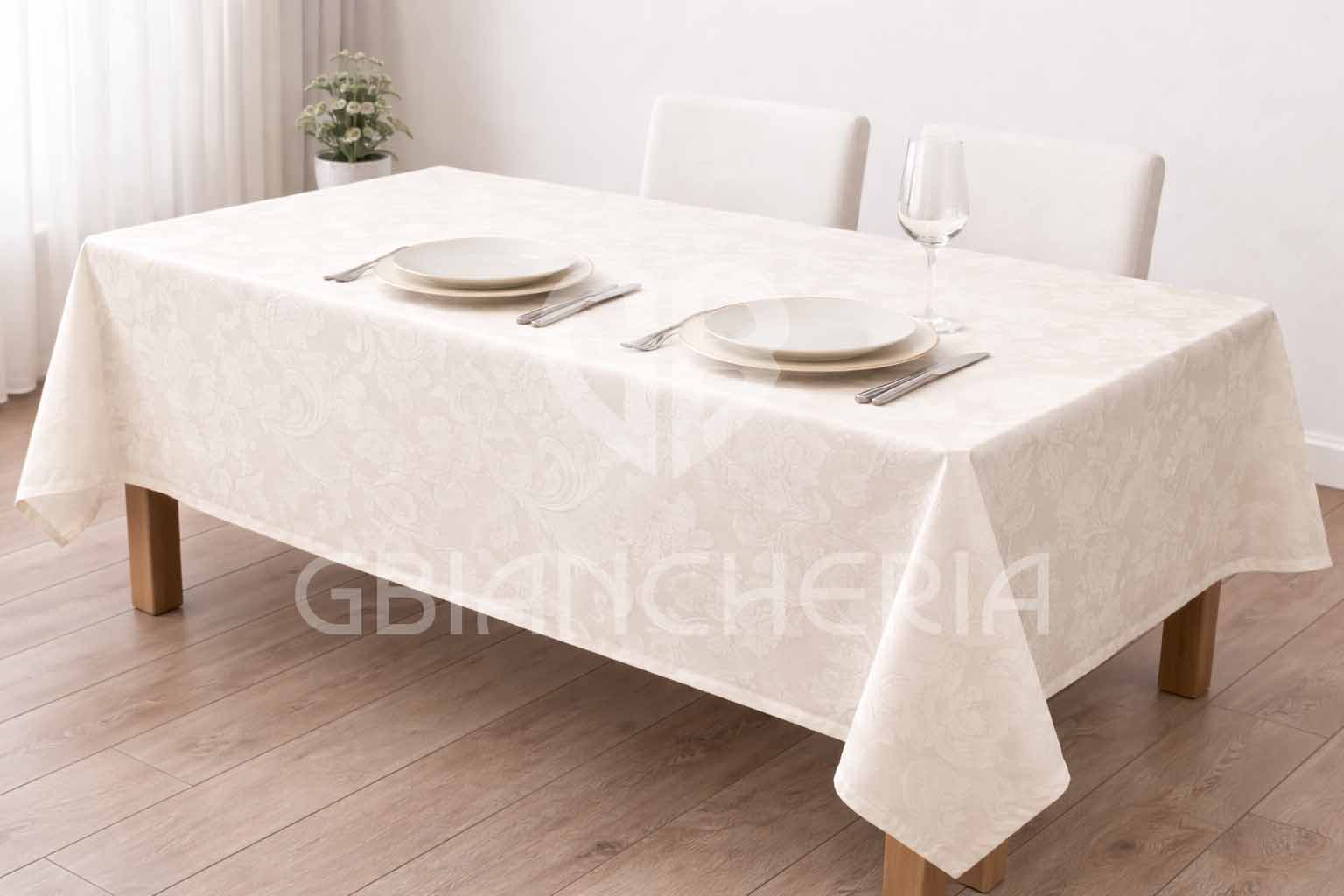 La tovaglia è rifinita con orlo semplice ed è progettata per offrire una caduta ordinata ed elegante sul tavolo.